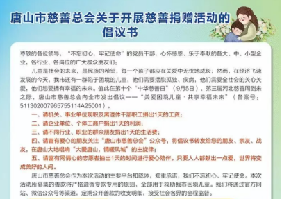 在河北唐山,唐山市慈善总会于“中华慈善日期间发布关于开展慈善捐赠活动的倡议书。倡议书提出:请机关、事业单位现职及离退休干部职工捐出一天的工资;请企业单位、个体工商户捐出一天的利润;请不同行业、职业的群众朋友捐出一天的生活费;请富有爱心的朋友关注“唐山市慈善总会”公众号,将倡议书转发给朋友、亲友、战友……据悉,此次筹集善款将用于唐山市困境儿童救助。